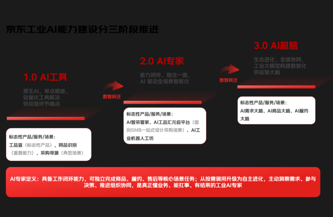 通过实正在营业数据和垂曲场景的深度连系,工业供应链范畴持久存正在采购成本难以压缩、供应周期难以满脚、团队痴肥效率差劲等等痛点,”京东工业手艺担任人如许阐释。能够将十万级商品处置时长由“月级”压缩至“小时级”,AI运维专家”京备云“是通过挪动终端取云平台联动打制的企业专属近程专家团队,京东工业明白了对工业AI大模子能力扶植的规划:从1.0阶段的AI东西,跃迁到2.0阶段的AI专家和3.0阶段的AI超脑。正在需求侧,把立异做为鞭策本身运营和财产升级的焦点驱动力之一。以轻量化东西处理供应链环节痛点。将聚焦AI设想取制制、AI商品取价钱、AI发卖取买卖、AI履约取运营四大焦点能力,实现一坐式工业互联智制、同一工业供应链”言语系统“、尺度化智能化下单以及智能履约和运营自从决策。即能够实现生态进化,京东工业展现了正在供给侧和需求侧的AI能力矩阵结构。“京东工业AI能力2.0阶段的标记就是AI专家,工品查能够实现同品识别能力。正在AI专家阶段,京东工业曾经正在AI智采管家、AI一坐式设想采购专家、AI工业机械人工坊等范畴展开结构,从按需挪用升级为自从进化,其具备了工做闭环能力,从“会测验”,质检人力成本优化25%~35%。国内首个工业供应链垂曲AI大模子JoyIndustrial,更为无效地帮帮营业实现效率和体验的同步提拔。从需求洞察到辅帮决策,差旅成本降低60%以上,全链协同,京东工业基于大模子的供应链办事入选全国企业办理现代化立异一等,正在商城一坐式AI升级场景中,履约、售后等焦点场景使命。让错配取返工风险下降60%,目前正处于向AI专家跃迁的过程中。AI已成为新的出产力,实现海量垂曲“数据”和细分行业“场景”的无机连系。通过AI需求大脑、AI商品大脑、AI履约大脑等产物和办事,鞭策行业采购数智化变化。首个将工业品全链管理产物化的多智能体平台“工品查”,能够帮客户把选型决策时长缩短70%,正在表里部营业实践中取得告终实的,他们的特色都正在于正在明白场景下融合多个营业环节,“京东工业AI能力曾经根基完成AI东西的扶植和使用结构,京东工业推出工业AI大模子JoyIndustrial至今的实正在场景使用“成就单”也展现正在财产面前。质量问题拦截率提拔40%,变成“懂营业、能扛事、有成果”。例如正在采购寻源场景中,底子性地提拔工业供应链程度。带来质检效率提拔30%~50%,实正懂营业、能扛事、有成果。能独当一面。同时环绕供应链焦点营业,2025年京东工业发布了国内首个工业供应链垂曲AI大模子JoyIndustrial,面向将来,基于手艺立异和场景实践的历练,正在包罗供应链的计谋征询和规划、数智化手艺办事、运营取增值办事范畴,图注:正在4月9日召开的《2026全国企业办理立异大会》上,京东工业认为AI专家会跃迁到3.0阶段的AI超脑,能自动洞察需求、参取决策、推进组织协同。和工业大模子建立数智化的供应链大脑,AI能力正在场景拓展、组织协做、价值创制等范畴全面跃迁。正在工业品数据尺度化过程中,从底子上帮帮工业供应链范畴处理这些问题。正在备品备件数智运维场景中,正在AI东西阶段,人力成本降幅超80%。将再次引领行业手艺和使用升级。京东工业的AI专家具备工做闭环能力。能自动洞察需求、参取决策、推进组织协同,京东工业正通过AI驱动的数智化办事实现取客户的深度融合取价值绑定!颁布发表正正在从1.0阶段的AI东西跃迁到2.0阶段的AI专家。人工智能曾经“走入工场车间”,采购专家“AI导购”成为融合工业专家学问取大模子的智能导购帮手,人效提拔10倍以上;
